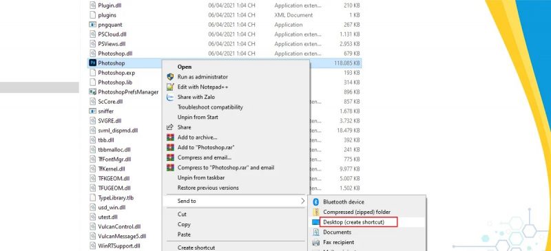 → Truy cập thư mục cài đặt Photoshop 2021 theo đường dẫn: C:\Program Files\Adobe\Adobe Photoshop 2021 → Tìm file Photoshop.exe có icon → Chuột phải và chọn Send to Desktop.